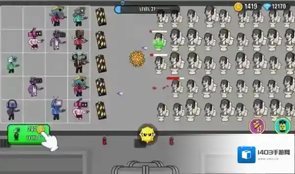 3、防御塔自动攻击,若金币足够,可再部署新塔,拦截马桶怪,守护左侧区域,通关Level1。